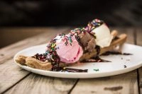 2 mega CHURROS artesanal, com 03 bolas de sorvetes (chocolate, baunilha e morango) em cima, muita calda de chocolate em cima e granulado!