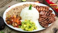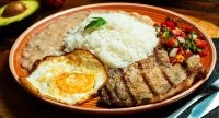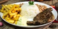 Bisteca suina grelhada (marinada 24 horas), arroz, feijão carioca, ovo frito, pico de galo e batata frita.