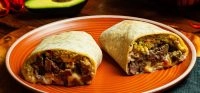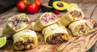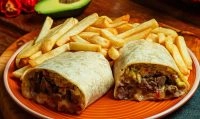 Tortilla de trigo mexicana, sou cream, guacamole, pico de galo, arroz, frijoles, queijo e recheio a sua escolha.