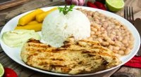 File de frango grelhado (Marinado por 24 horas), arroz, feijão carioca, aiolli e polenta.