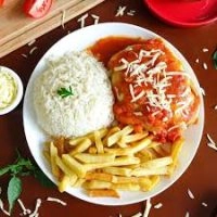 Bife de Alcatra a parmegiana, com molho vermelho natural, Arroz, e batata frita