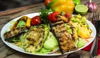 Mix de Folhas verdes, legumes grelhados ( beringela, abobrinha italiana, abobora japonesa, pimentões, e batata doce) Guacamole, pico de galo e Aiolli.