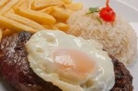Contra filé grelhado, arroz, feijão carioca, batata frita palito, aiolli e ovo frito.