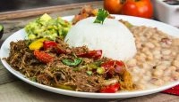 File de Pernil desfiado ao molho barbecue, arroz, feijão carioca, guacamole e pico de galo.