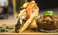São três unidades de tacos crocantes de milho com aproximadamente 11cm cada um, onde você escolhe os recheios, e acompanha uma bebida, podendo ser refrigerante, ou agua